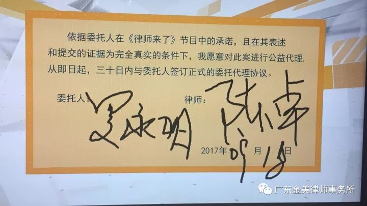 最终陈卓律师以其专业的法律知识,简明有力可操作性强的代理方案赢得当事人的认可,当场与当事人签订了委托代理意向书,并于30日内与当事人签订了公益委托代理合同。