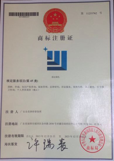 经过两年的品牌建设,金美所已取得了一定的成就,品牌价值日益提升。同时,为了配合和保障金美所的品牌建设,金美所注重对律所品牌的知识产权保护,积极申请商标注册。现已经获得了国家工商行政管理总局商标局核准注册的广东金美律师事务所中英文名及logo的商标注册证。以案件质量提升品牌价值,以品牌促进优秀人才的引入及团队建设,金美所在知识产权保护方面已经走在了时代及同行的前列。